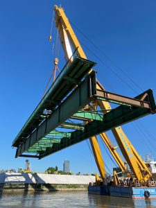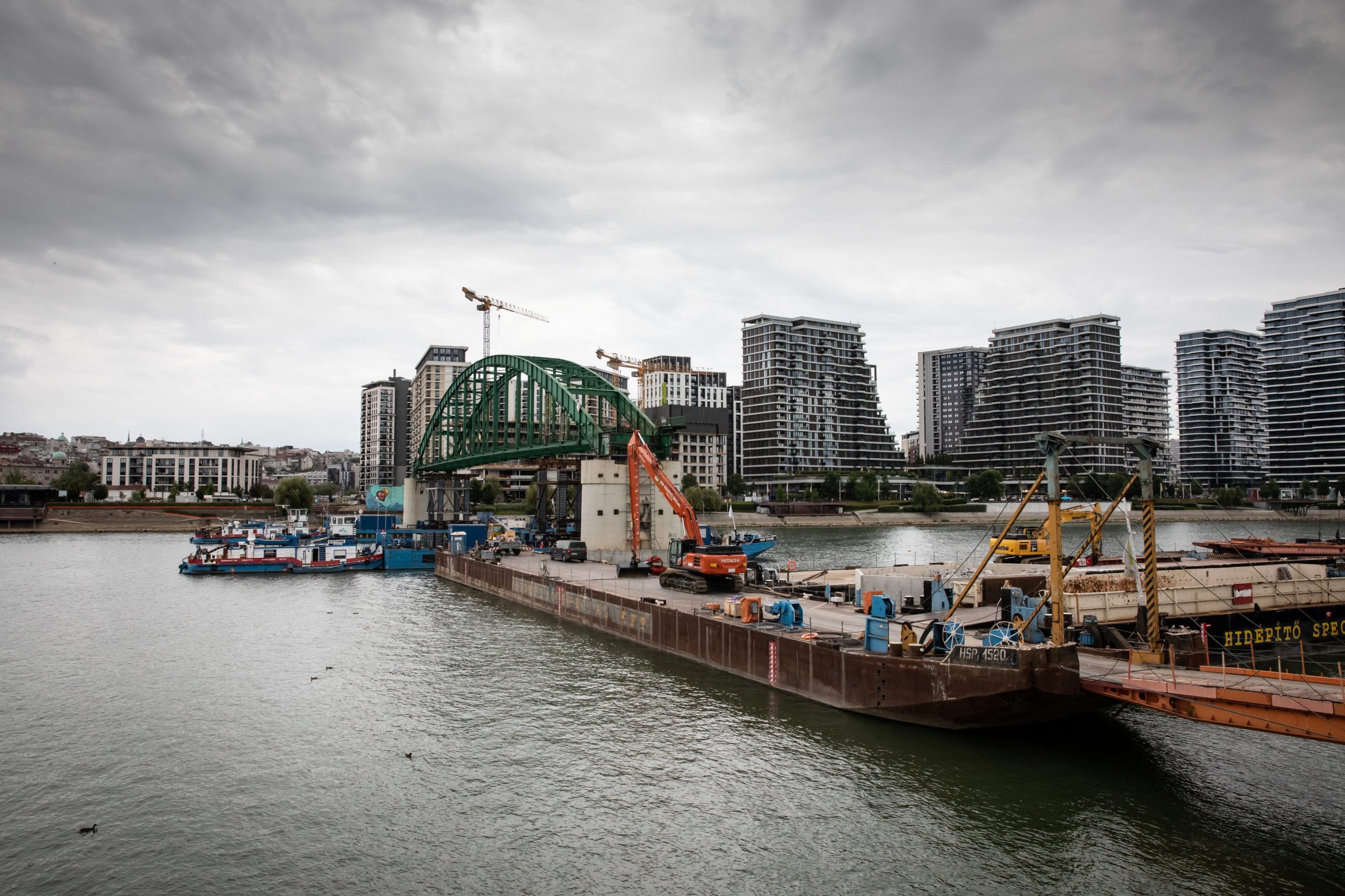 The highlight of the project was the removal of the arch bridge: the nearly 420-ton structure was lifted from its position using a hydraulic lifting system installed on two 52-metre barges. The operation was preceded by extensive preparation, with the maintenance, testing, and fine-tuning of the lifting equipment carried out in Mohács, and the control system recalibrated by VOX Automatika Ltd. The arch structure temporarily remained on the barges and, following the completion of the shoreline sliding track, was transferred to land through a multi-day, phased operation.