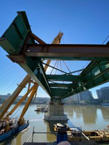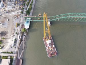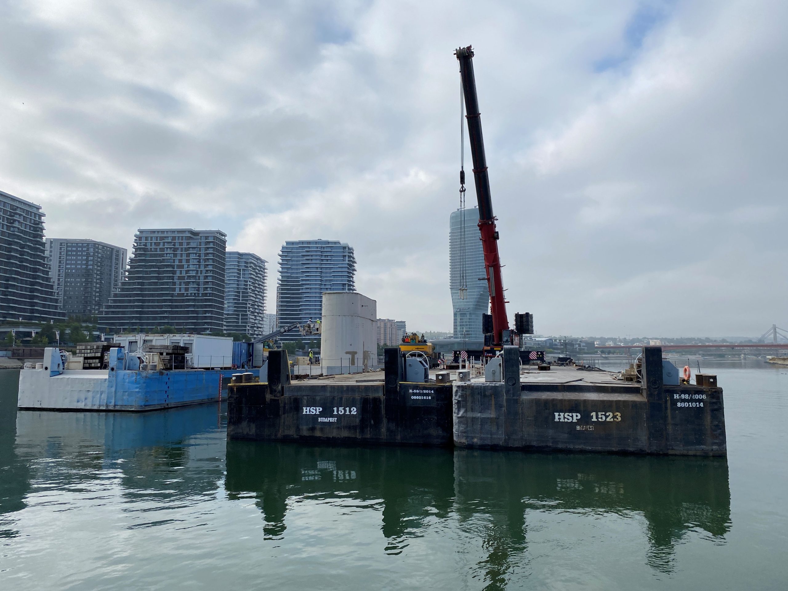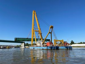 During the demolition works, the superstructure elements were removed first. Using the Clark Ádám floating crane, the left and right bank bridge sections were lifted one by one, with the 112- and 135-ton steel components manoeuvred on the Sava River with centimetre-level precision. For the water operations, HSP’s TS80 and TS40 barges, along with push boats and motorboats, ensured accurate positioning and operational support, while the professional rigging of the steel structures was carried out by the rope access specialists of 3D-Acél Ltd.