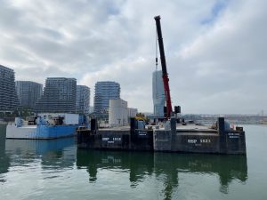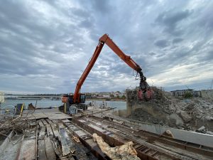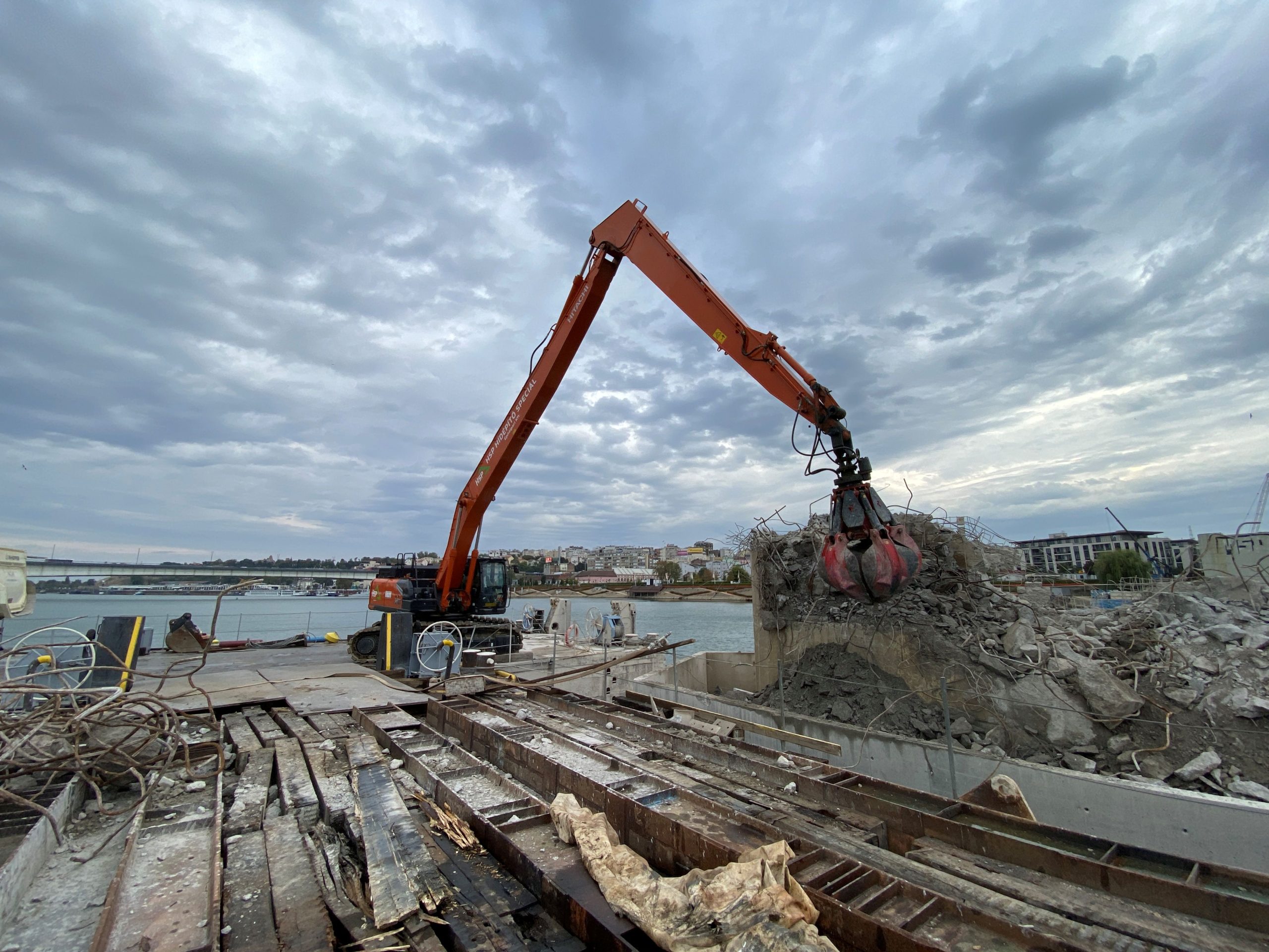 After the removal of the superstructure, the focus shifted to the demolition of the piers, where above-water and underwater works were performed in parallel. Following the cutting operations carried out by Hídépítő Ltd., HSP provided the waterborne support, crane operation conditions, as well as the transport and handling of the dismantled elements. Throughout the project, our crawler excavator worked continuously, extracting the timber piles forming the foundation of the piers with a deep digging bucket, while the concrete debris resulting from the pier demolition was loaded onto trucks using a clamshell grab.