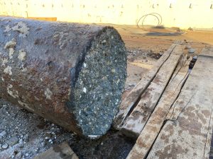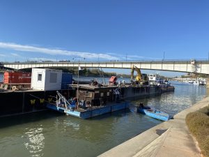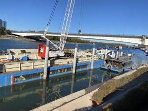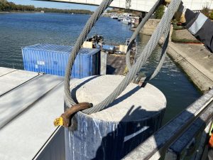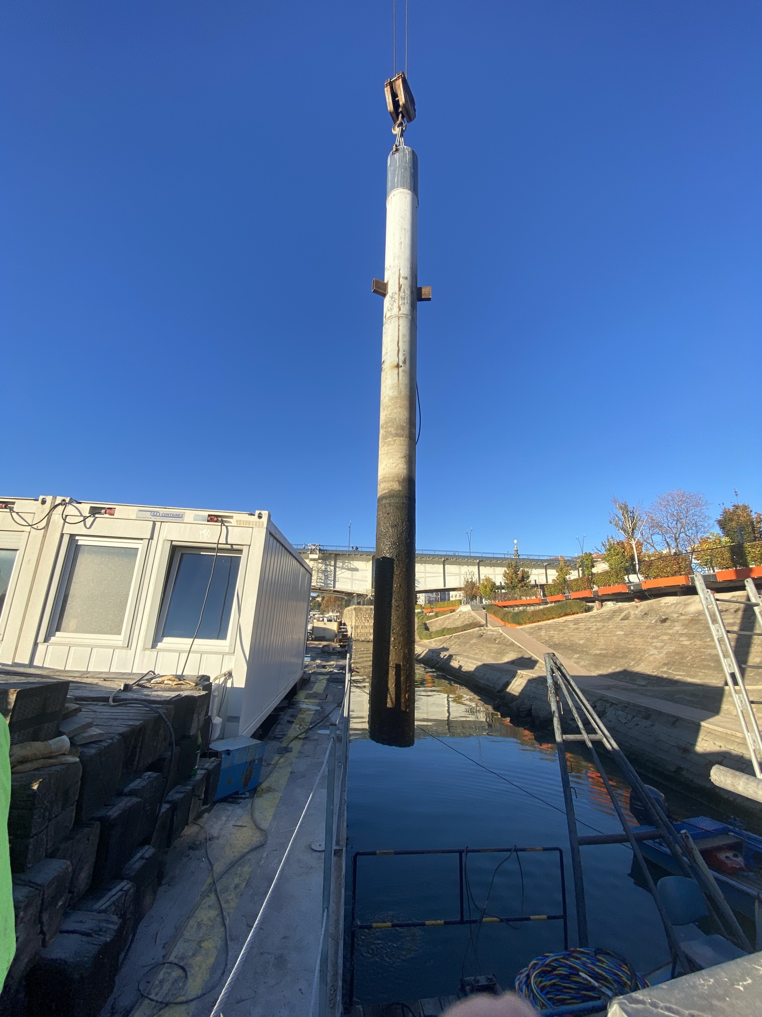 The demolition involved seven steel-sleeved, concrete-filled piles, each with a diameter of 600 mm. The elements were approximately 11 metres long and weighed around 11 tonnes each. Due to their size and location, removal was only possible from the water, with the involvement of industrial divers. A barge was positioned alongside the work area and equipped with a crawler-mounted lattice-boom crane, while lifting operations from the shoreline were supported by a mobile crane with a man basket.