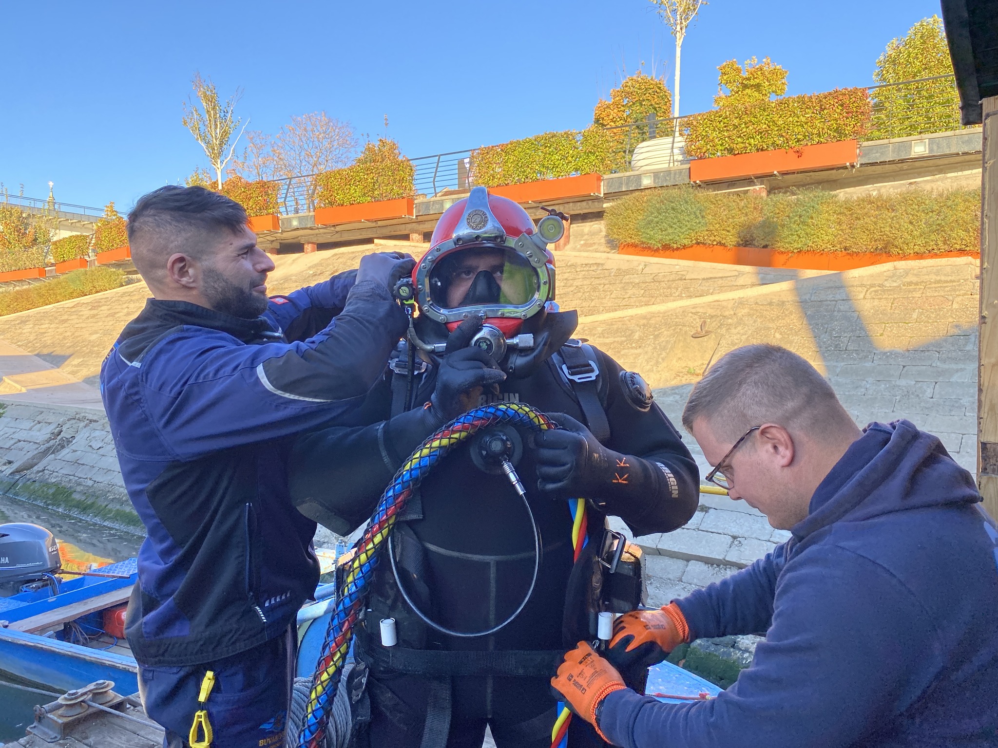 The underwater cutting operations were carried out by industrial divers working from a diving stage. Using a cutting template on the riverbed, they performed circumferential cuts on the steel casings, ensuring precise and fully controlled demolition. Following the cutting process, the upper section of each pile was tensioned with a steel winch, the internal concrete core was broken, and the separated elements were lifted to the surface by crane. The works were executed as part of the project of Hídépítő Zrt., in close cooperation with the specialists of Búvár Kft.