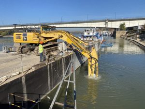 After the extraction of the piles, an additional underwater demolition task requiring high precision followed. Inside the piles, residual concrete protruded approximately half a metre above the riverbed. This material had to be removed without damaging the surrounding slope and riverbed structure. A hydraulic breaker was mounted on an excavator positioned on the TS80 barge, while a diver working on the riverbed manually guided the position of the breaking tool. Throughout the operation, only the absolutely necessary amount of concrete was removed, with phased inspections and continuous repositioning.